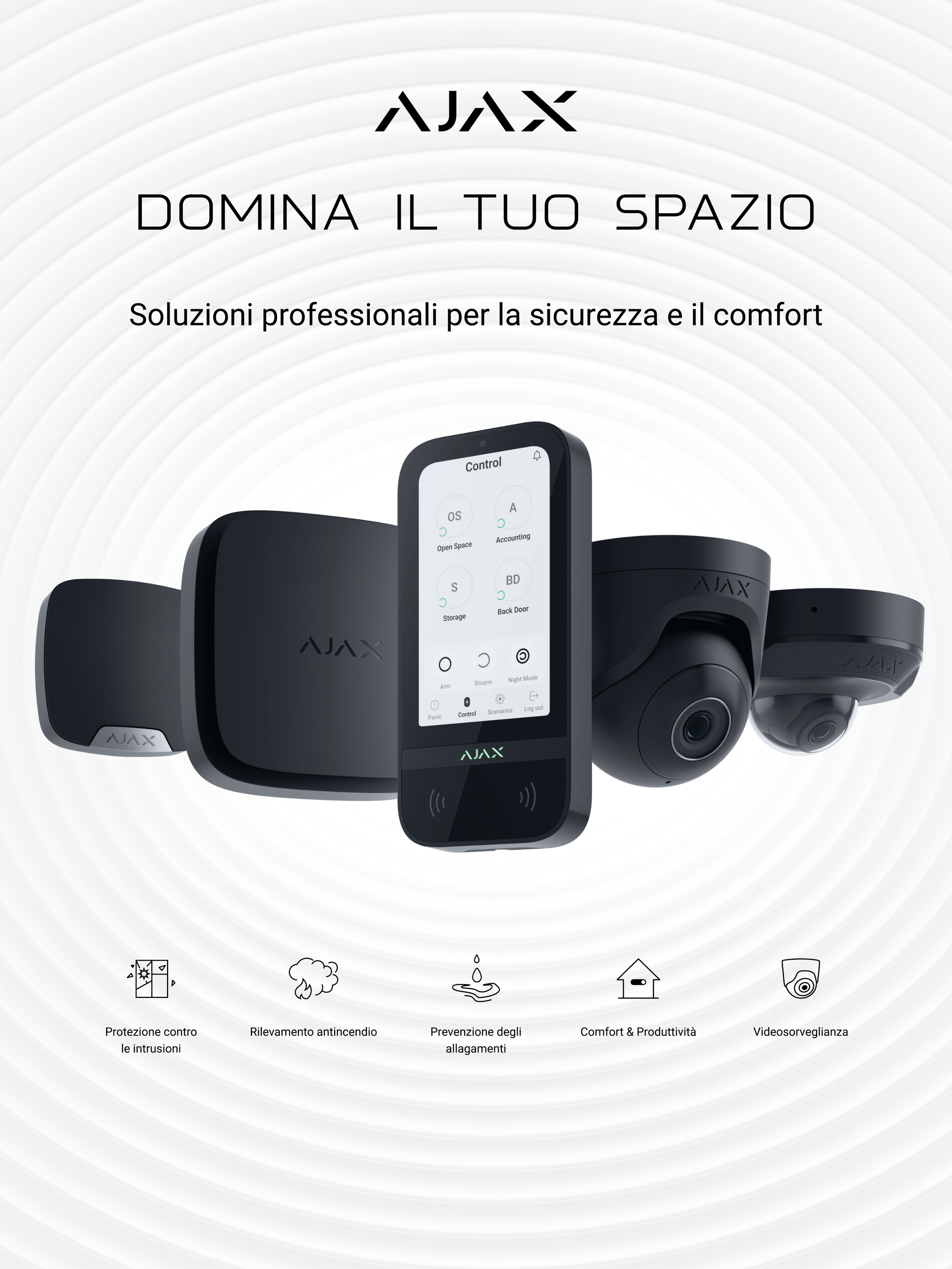 Queste soluzioni vi assicurano la protezione integrale degli ambienti dove vivete o lavorate, comprese le zone esterne e i punti di accesso: possono essere attivati anche quando siete in casa e sono ideali anche per le abitazioni isolate.
